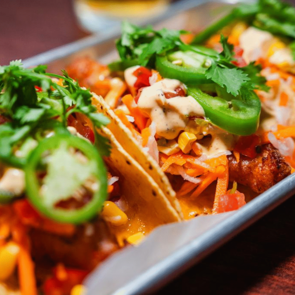 דג בגריל או בטמפורה, עם ירקות כבושים, גבינה, ג'לפינו, סלסת תירס, כוסברה ורוטב הב.