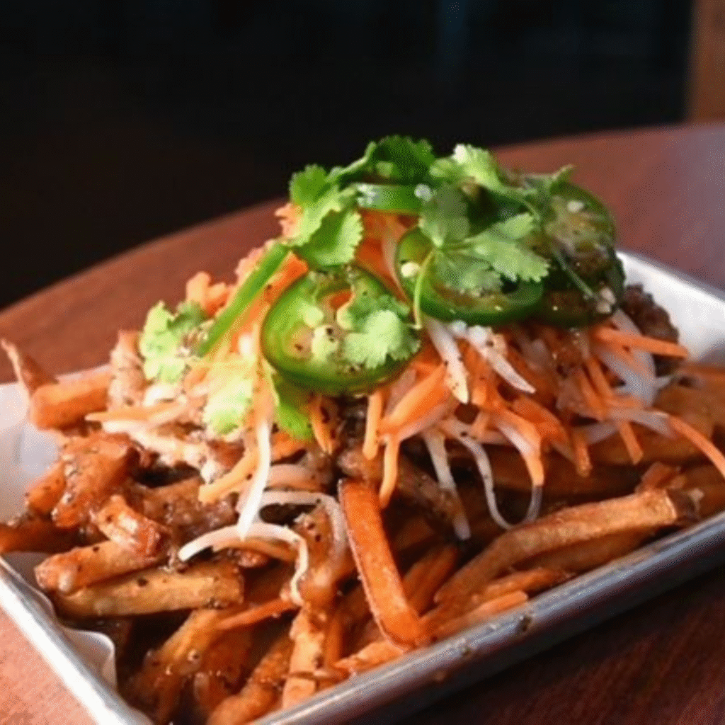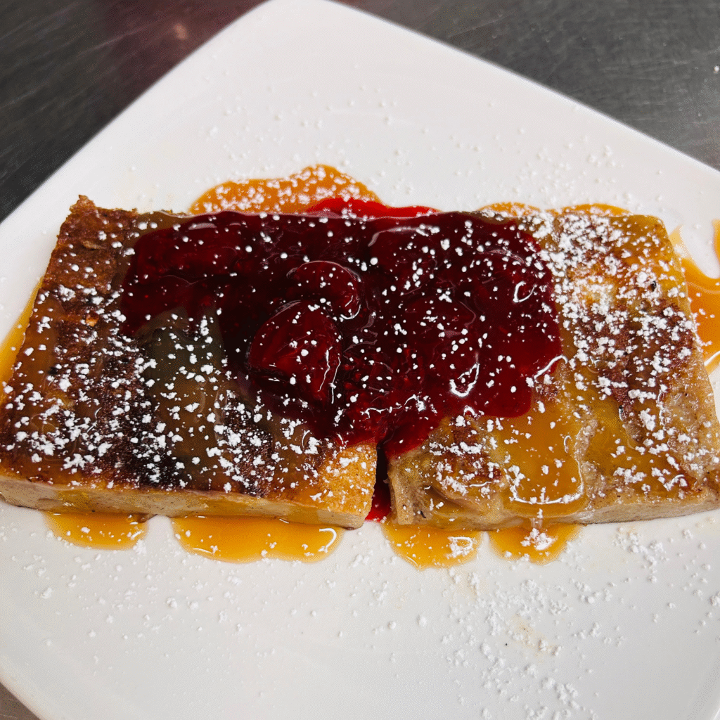גבינה לבנה, פלפלים כבושים, בצל מטוגן ורוטב ברביקיו.