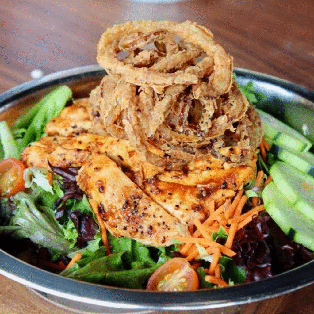עוף בגריל, חסות, מלפפונים, גזר, עגבניות, גבינה צ'דר ובצל מטוגן.